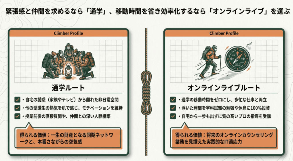 - 自分にとって「通学」と「オンラインライブ」のどちらが合っているかの判断基準