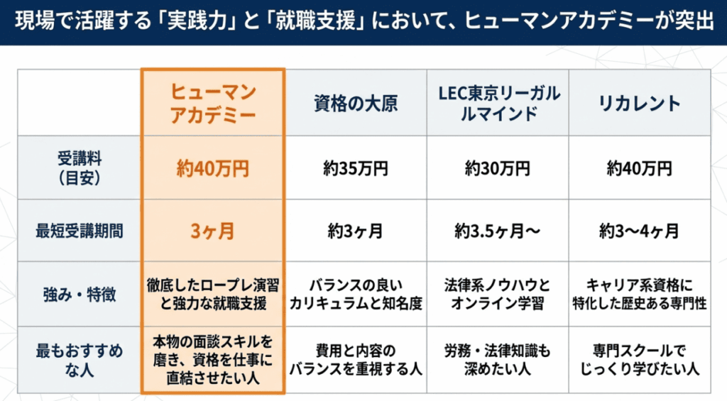 ヒューマンアカデミーのキャリアコンサルタント養成講座は、他社と比較しても「実践的なロープレ指導の量」と「修了後の就職サポート」において頭一つ抜けた存在です。