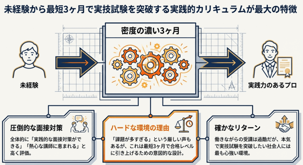 ただ、このハードな環境こそが、未経験からでも最短3ヶ月で合格レベルまで引き上げてくれる最大の理由となっています。