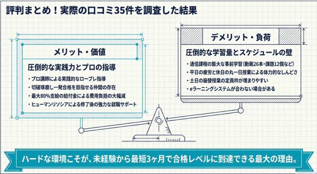 約40万円という受講料や、ハードな学習スケジュール、修了試験の難易度に関する疑問など、事前にクリアにしておくべき重要なポイントばかりです。