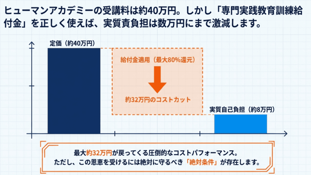 - 約40万円の受講料も給付金(最大80%)やヒューマンアカデミー独自の割引制度を活用すれば大幅に負担が減る