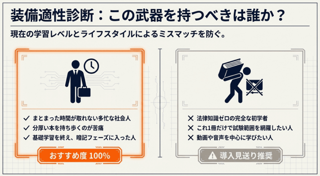 | まとまった勉強時間が取れない社会人 | 法律の基礎知識がない完全な初学者 |