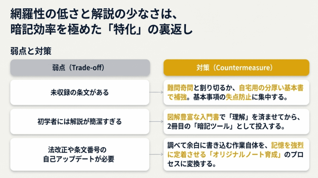 | 要点が凝縮され暗記作業に集中できる | 法改正情報の追記や確認が必要 |