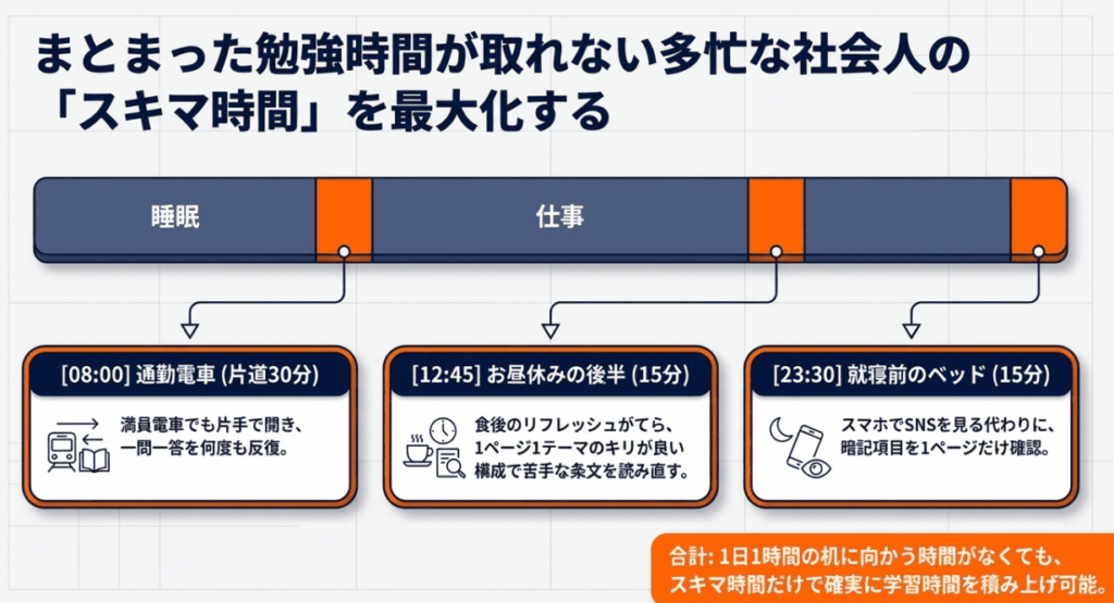 まとまった時間が取れない社会人にとって、スキマ時間をいかに活用するかが合否を分けます。