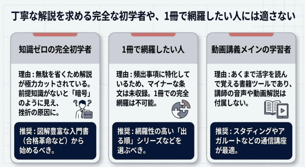 合格に必要な基礎知識や細かい条文が削られているため、本試験のひねった問題に対応できません。