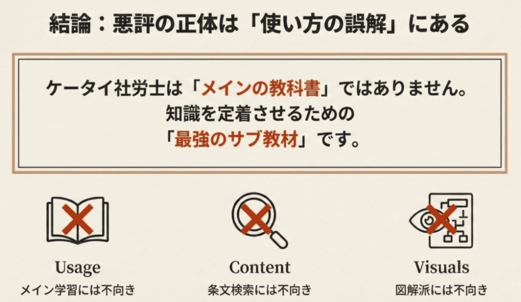 ケータイ社労士は、分厚い基本書を補完し、知識を定着させるための「最強のサブ教材」として設計されています。