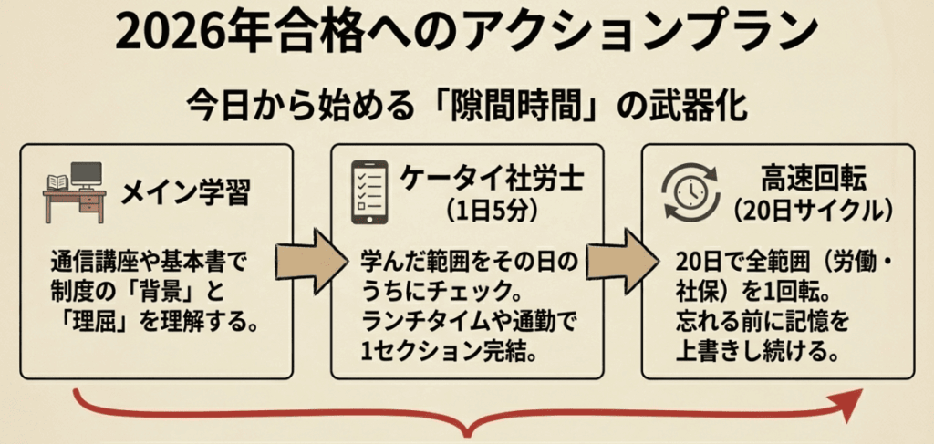 - メイン教材(講座や分厚いテキスト)で「理解」し、ケータイ社労士で「暗記」する役割分担が王道です。