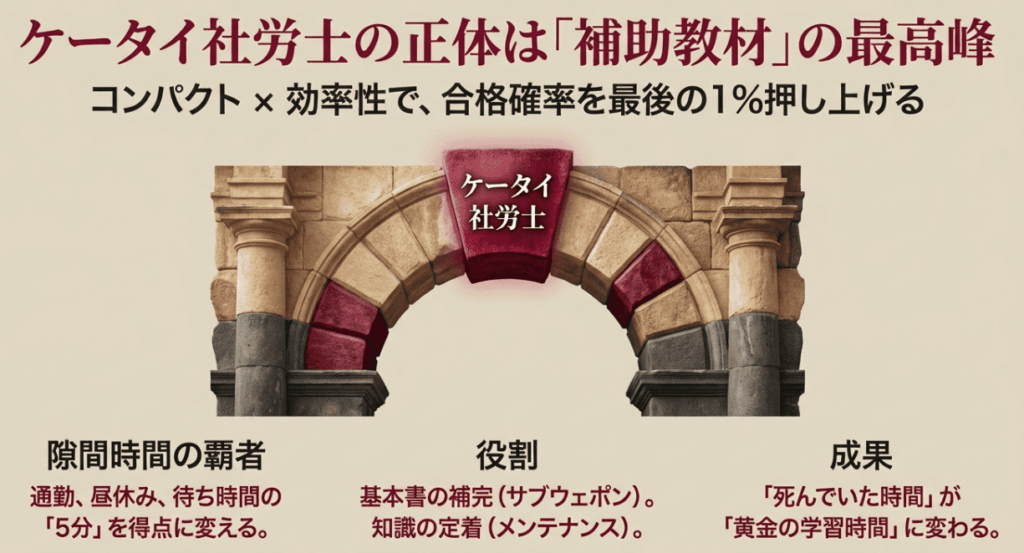 「ケータイ社労士」の評判を多角的に分析した結果、本書は「これ1冊で合格を目指すメイン教材」ではなく、隙間時間を黄金の学習時間に変える「最強の補助教材」であるという結論に達しました。