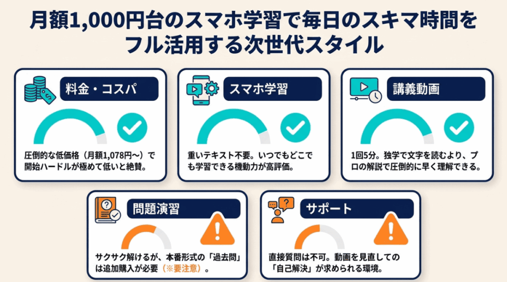 まとまった時間が取れない社会人にとって、通勤電車や休憩時間などのスキマ時間だけで学習が完結するのは本当に助かります。