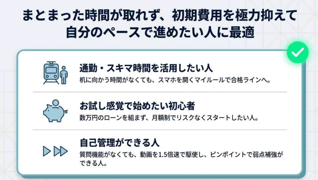 | 独学でのスケジュール管理に抵抗がない人 | まとまった時間を確保して短期間で一発合格したい人 |