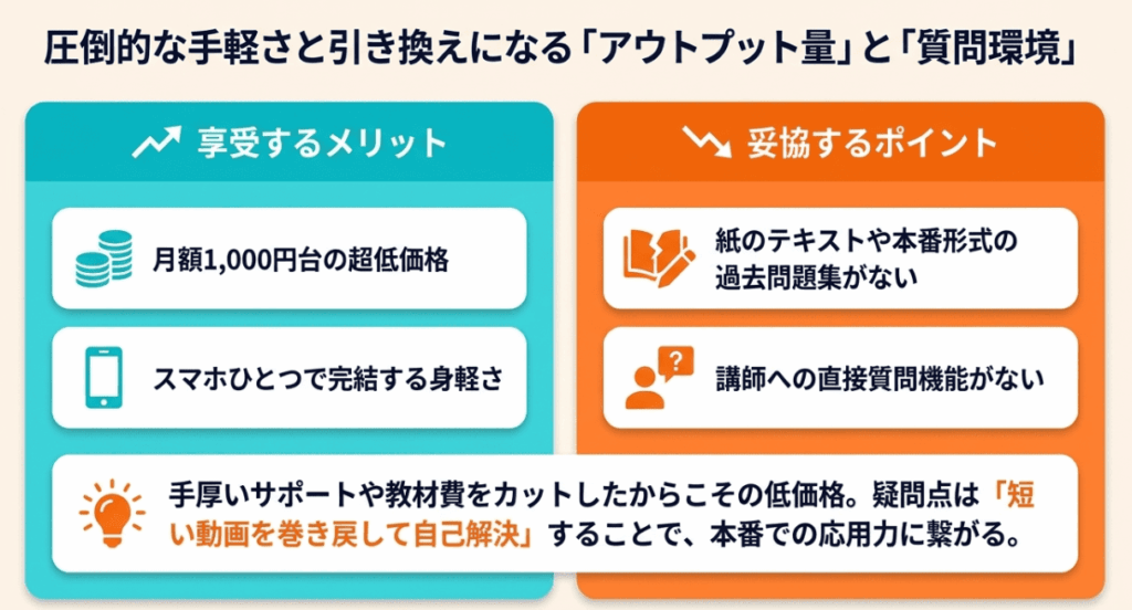 Web上でサクサク解ける問題演習は便利ですが、紙のテキストや過去問がない点には少し工夫が必要です。