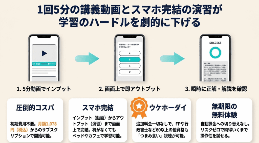 実際に利用している方からも、「通勤電車の中でサクサク進められた」「ウケホーダイで他の資格もインプットできた」といった喜びの声が多く寄せられています。