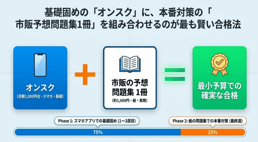 オンスクのスマートフォン学習だけでは足りないアウトプット量は、市販の予想問題集を1冊買い足すことで補えます。