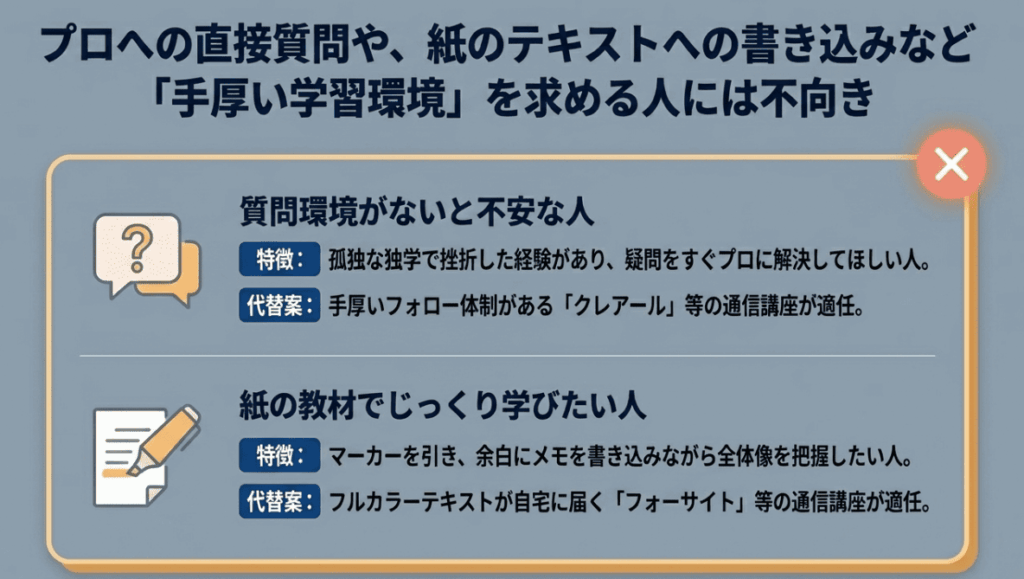 - 講師の手厚い個別サポートが欲しい人や、紙に書き込んで勉強したい人には向いていない
