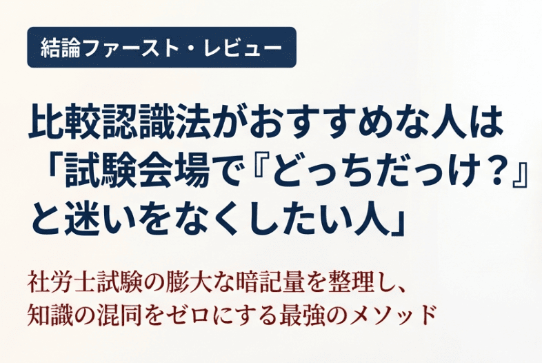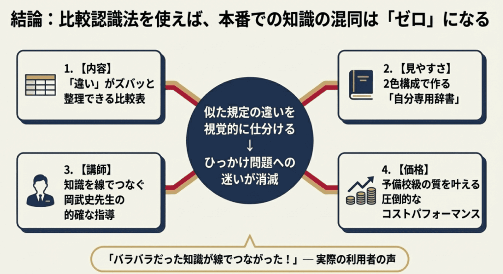 口コミでも多くの方が述べている通り、比較認識法は「どっちだったっけ?」という試験本番での迷いを最小限に抑え、得点力を養うために非常に有効な手段です。